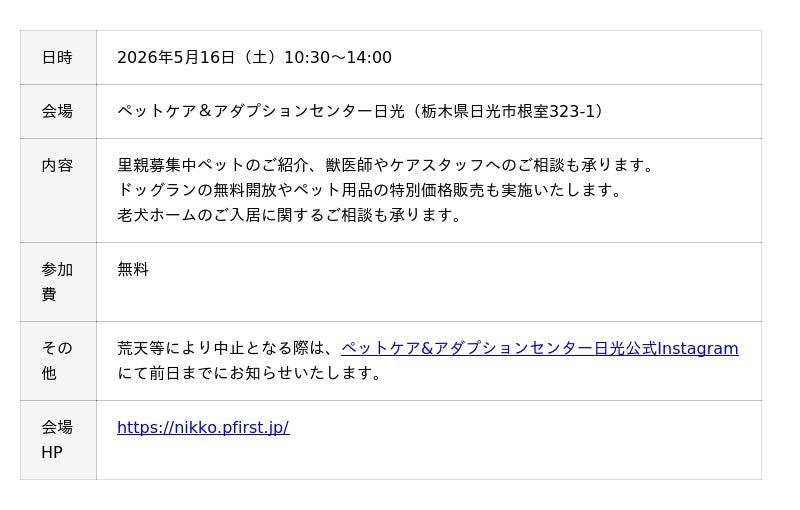 “Pets always come first”を理念に掲げるペッツファーストホールディングス株式会社(本社:東京都目黒区、代表取締役︓坂本 晴彦)は、当グループが運営するペットケア施設「ペットケア&アダプションセンター日光」にて、2026年5月16日(土)に「ふれあい」をテーマとした里親譲渡会を開催いたします。