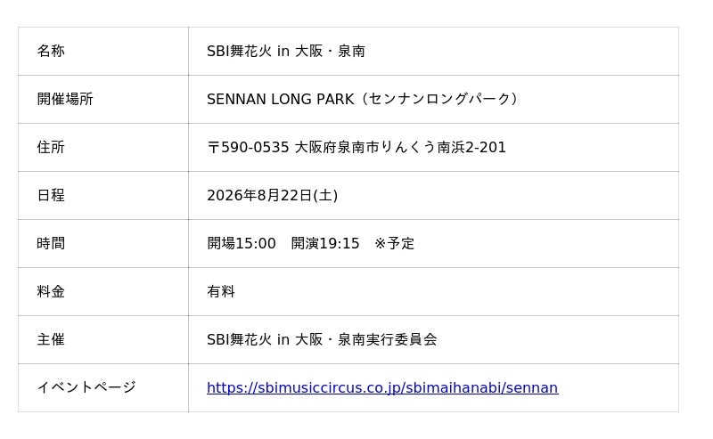 株式会社SBI MUSIC CIRCUS(本社:東京都港区、代表取締役社長:大付楽洋、以下「当社」)は、2026年8月22日(土)、SENNAN LONG PARK(センナンロングパーク) にて開催する「SBI 舞花火 in 大阪・泉南」 の有料観覧席を2026年4月27日(月)10:00よりチケットぴあにて先行販売開始いたしました。