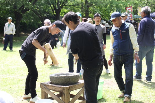 花立山を楽しむ会 ~春の茶会~春の採れたて野菜やまんじゅうなどが販売される特産品コーナーや、だんご汁・おこわなどのお食事コーナーなど、地元の美味しいものを楽しめます。香り豊かなお茶を堪能できる茶会、「ひょっとこ踊り」も。