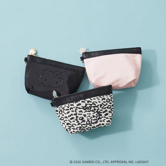 ハローキティのフェイスが立体的にプリントされた使いやすいサイズの舟型ポーチ。