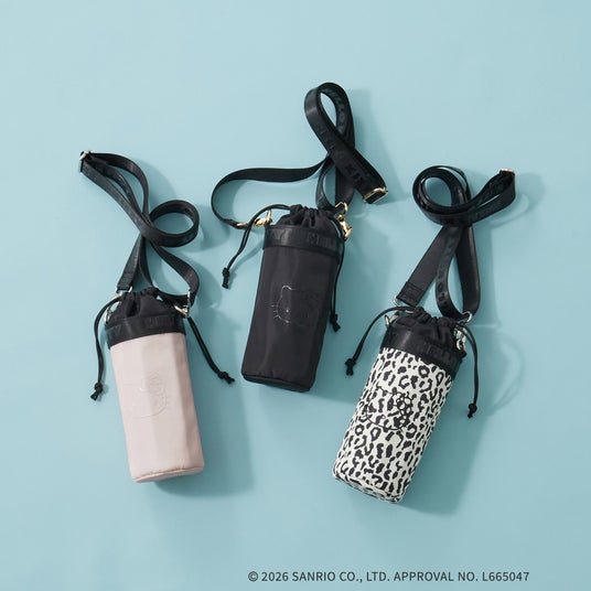 ハローキティのフェイスが立体的にプリントされたスリムケースは、内側が保冷仕様になっており、アウトドアシーンでのペットボトルの持ち運びなどにも最適。