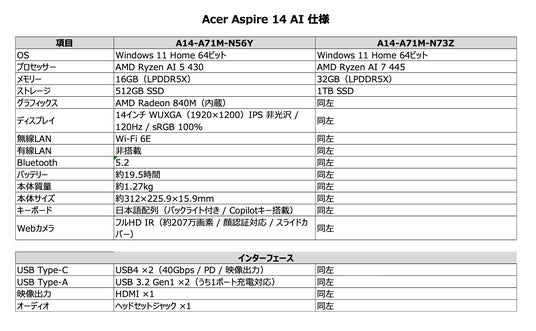日本エイサー株式会社(本社:東京都新宿区、代表取締役社長:ボブ・セン)は、AMD Ryzen AI 5 430プロセッサーまたはAMD Ryzen AI 7 445プロセッサーを搭載した14インチノートPC「Aspire 14 AI」シリーズ2機種「A14-A71M-N56Y」「A14-A71M-N73Z」を、本日2026年4月30日より発売いたします。販売はAmazonおよびAcer公式オンラインストアにて行います。
