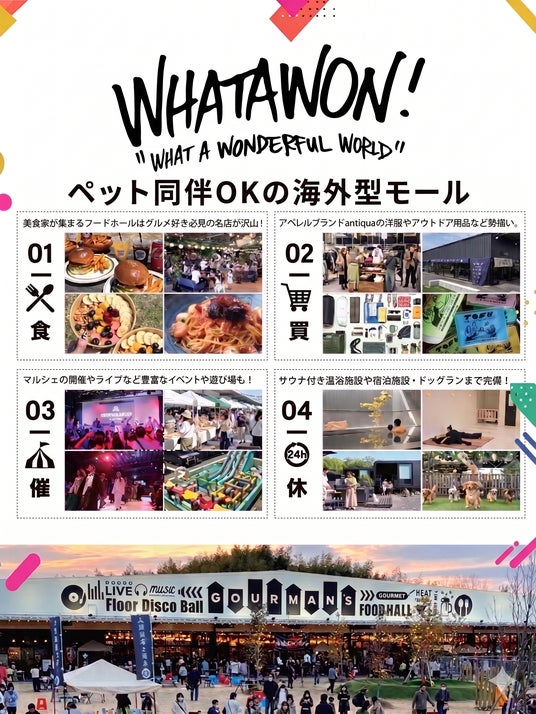 日本最大級ペット同伴OKの海外型モール『WHATAWON』南大阪に位置するWHATAWON(ワタワン)は、グルメ、ショッピング、温浴施設など、多様な楽しみが詰まった複合施設。ペットを家族の一員として大切にされている多くの飼い主の皆さまも快適にお楽しみいただけるように設計された、ペットフリーの新しいスタイルのエンターテインメントモールです。