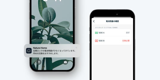 スマートロック最大の不安が「電池切れによって作動せず、家に入れなくなること」。「Nature Remo」と連携することで、電池残量が低下したタイミングでプッシュ通知が届きます。また、普段から家電操作で開く「Nature Home」アプリでいつでも電池残量を確認できます。電池が切れてから気づくのではなく、余裕を持って交換できるのが、締め出しを未然に防ぎ安心して使えるポイントです。