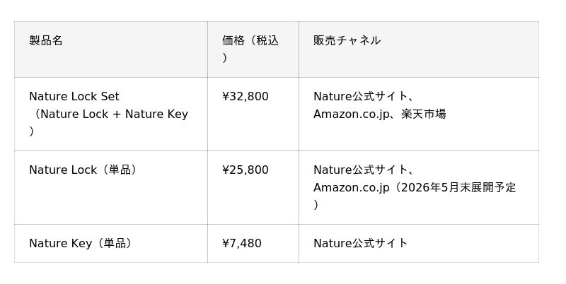 「Nature Lock」と「Nature Key」のセット「Nature Lock Set」(¥32,800・税込)はNature公式サイト、Amazon.co.jp、楽天市場にて販売いたします。あわせて、予約販売期間中に寄せられた「『Nature Lock』だけほしい」というユーザーの声を受け、本日より「Nature Lock」単品(¥25,800・税込)でのご購入にも対応いたします。