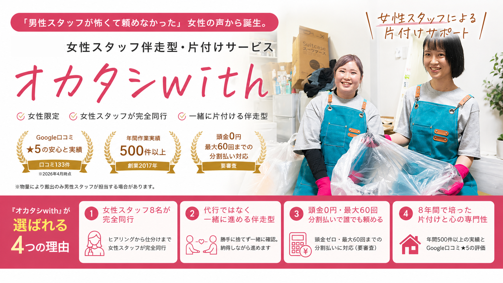 こうした背景を受け、当社では8年間の現場経験で培った片付け・買取・分割払い対応のノウハウに、女性スタッフによる「伴走型」の対応を掛け合わせた新サービス『オカタシwith』を開発しました。