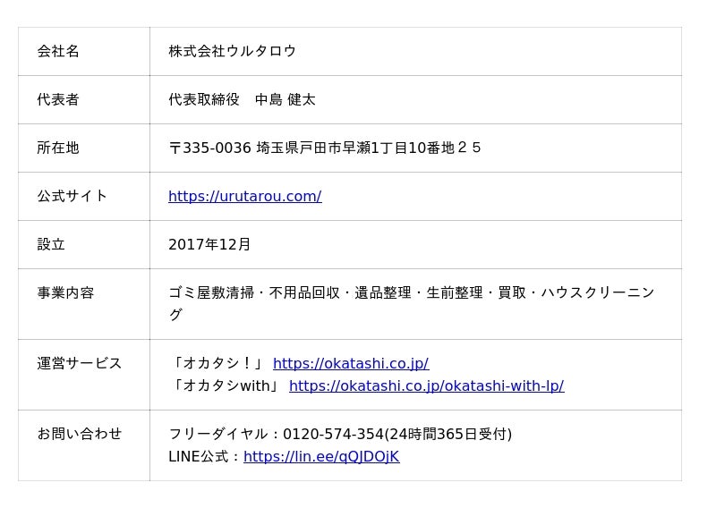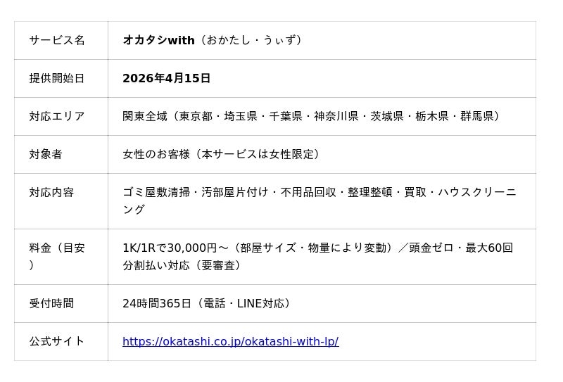 年刊500件以上のゴミ屋敷清掃・遺品整理・不用品回収を関東全域で手掛ける株式会社ウルタロウ(本社:埼玉県戸田市、代表取締役:中島健太)は、女性スタッフが依頼者と一緒に片付けを進める”伴走型”の女性向け伴走型片付けサービス『オカタシwith』を、2026年4月15日より関東全域で提供開始しました。本サービスは、「男性スタッフを家に入れるのが怖い」「勝手にモノを捨てられたくない」という女性利用者から長年寄せられてきた声を受けて開発した、女性限定・女性スタッフ対応のサービスです。経験豊富な女性スタッフ8名がヒアリングから仕分けまで完全同行し、頭金ゼロ・最大60回までの分割払いにも対応。一人で片付けに悩む20~30代の女性を中心に、新たな受け皿となることを目指します。