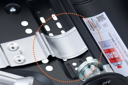 ▲カセットボンベが過熱された際に自動的に外れる「圧力感知安全装置」