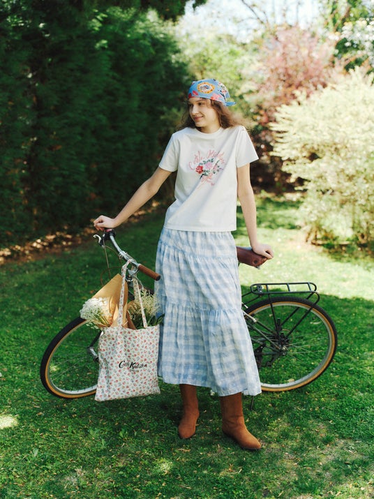 体に沿いながら広がるシルエットは、ボリュームを抑えることで着膨れを防ぎ、上品で可憐な印象を与えます。ウエストはゴム仕様でストレスフリーな着心地。色柄に合わせて生地を使い分けた、こだわりの一品です。「Spray Floral」は、Cath Kidstonらしいどこか懐かしさを覚える花柄。自然なシワ感のあるコットン生地を使用し、ナチュラルで柔らかな風合いで、質感とともにアートの鮮やかさを同時に楽しめる一着です。「Hackney Rose」はアーカイブのアートにインスパイアされた、ヴィンテージ感漂うエレガントなデザイン。花柄のレース生地にさらに花柄を重ねてプリントし、ブランドの世界観を贅沢に表現しました。「Painted Gingham」は手描きならではのナチュラルな線や、紙の質感まで再現した温かみのあるギンガムチェック。こちらも花柄のレース生地にプリントを施し、奥行きのある表情です。Tシャツや同柄のブラウスとのセットアップもおすすめです。日常のコーディネートに華やかさを添えてくれる、頼れる一枚です。