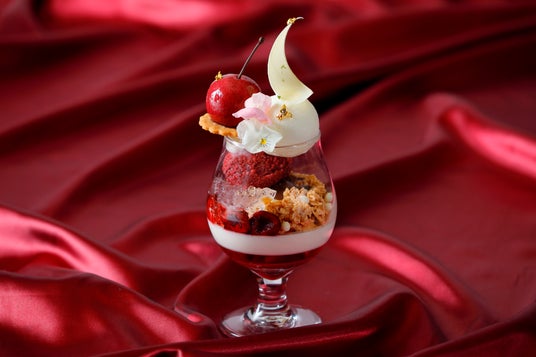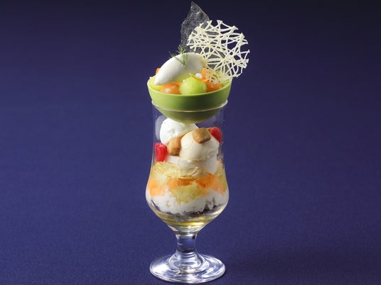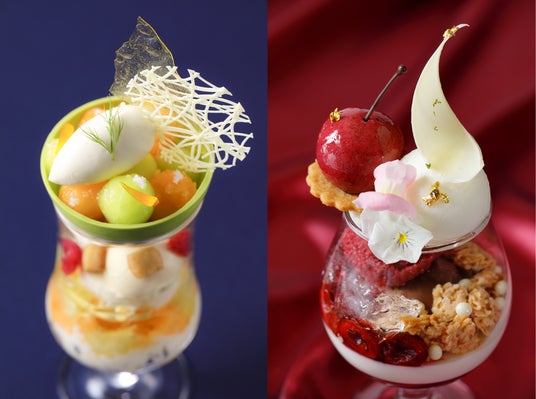 5月は、赤・青2種類のメロンに貴腐ワインの気品を添えた「ドゥース・メロン」が初登場。続く6月は、毎年ご好評をいただいている人気のパフェ「Lady Cherry」をご用意いたします。