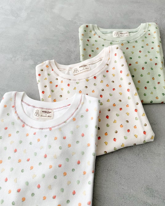 アパレルでは、「メルるん♪」を立体的な発泡プリントやレースであしらったTシャツ、色鮮やかなフルーツの総柄アイテムをご用意。フルーツモチーフを刺繍したベストやワンピース、日常使いにおすすめのエプロンもラインアップいたしました。