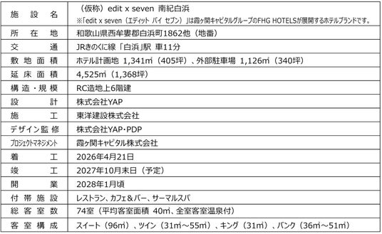 本事業は、両社が培ってきた住まいづくりのノウハウと、地域開発における知見を融合させた共同プロジェクトです。地上6階建の建物に、全74室の客室、レストラン、サーマルスパなどを備え、2028年1月の開業を予定しています。