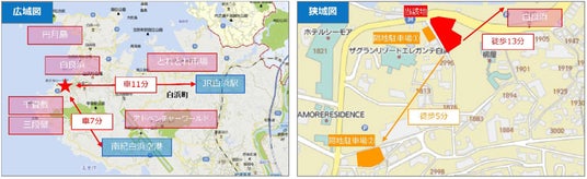 本計画地は、南紀白浜空港やJR「白浜」駅からのアクセスが良好で、名勝・白良浜をはじめとする主要な観光スポットにも近接した利便性の高いエリアに位置しています。こうした立地特性に加え、全客室への温泉の導入やミサワホームの住まいづくりの知見をいかしたFFE(家具・備品)を設置し、より快適にお過ごしいただける空間を提供します。