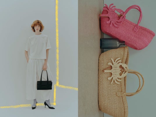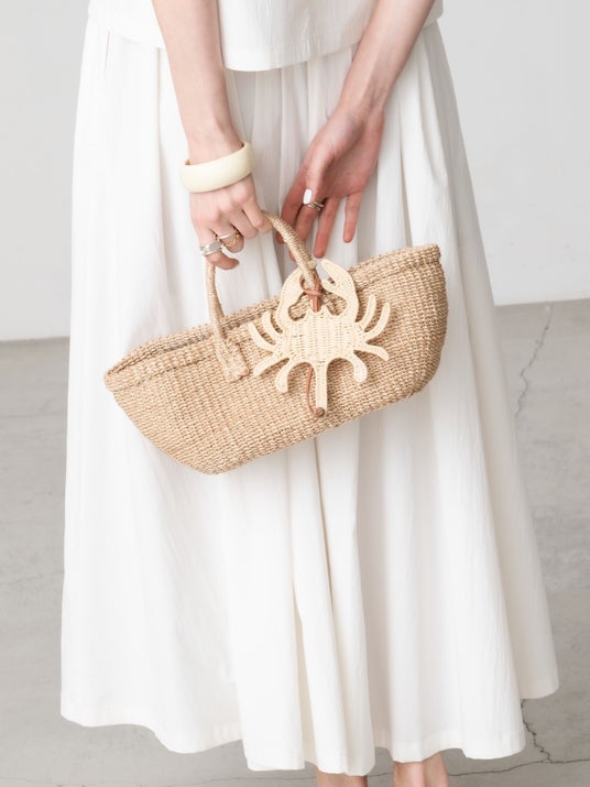 アバカバッグは、上質なアバカ(マニラヘンプ)を編み込んだ横長の大小2サイズで展開。鮮やかなピンクとベージュのカラーが、夏のスタイリングにアクセントを添えます。“カニ”モチーフのラタン素材を使用したうちわ兼バッグチャームが付属するなど、CABANABASHらしい遊び心も魅力です。