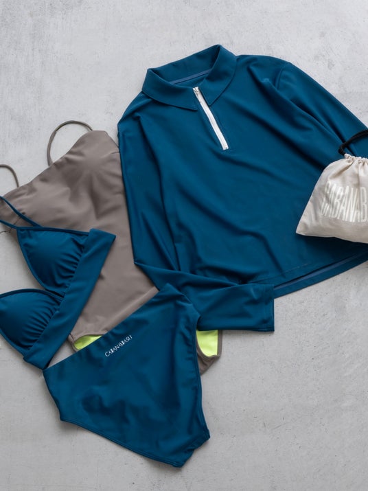 毎年大人気のスイムウェアも登場。ビキニやワンピース、ラッシュガードをブルーとグレーの2色で展開します。透けにくい素材感と機能性も兼ね備えているので、海でのシーンはもちろん、ヨガやフィットネスなど幅広いシーンでご着用いただけます。さらに、ビキニとワンピースには専用ポーチが付属し、旅行や持ち運びにも便利です。
