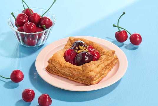 チェリーを贅沢にトッピングしたフルーツパイです。バターをたっぷり練りこんだ729層のサクサクパイ生地に、なめらかなカスタードクリームと、ダークチェリーの蜜漬けを乗せました。最後にサワーチェリーソースを合わせたフィリングをたっぷりトッピングし、甘酸っぱくさっぱりとした味わいに仕上げました。