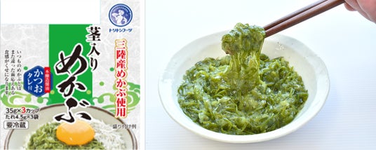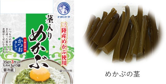 これまでほとんど使用されていなかっためかぶの硬い茎部分を、独自技術で丁寧に加工。細かくカットされた茎の部分がアクセントとなり、いつものめかぶとはひと味違う食感をお楽しみいただけます。うす塩で味付けされているほか、本醸造醤油を使用したかつおタレも付属しているため、そのままで美味しくお召し上がりいただけます。