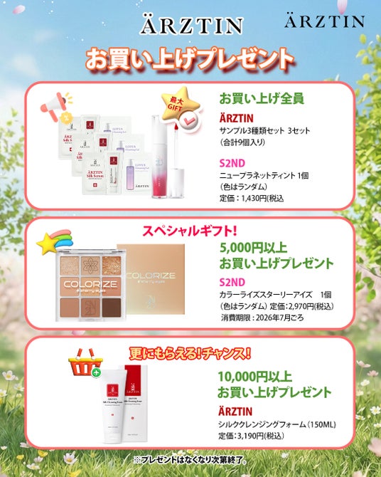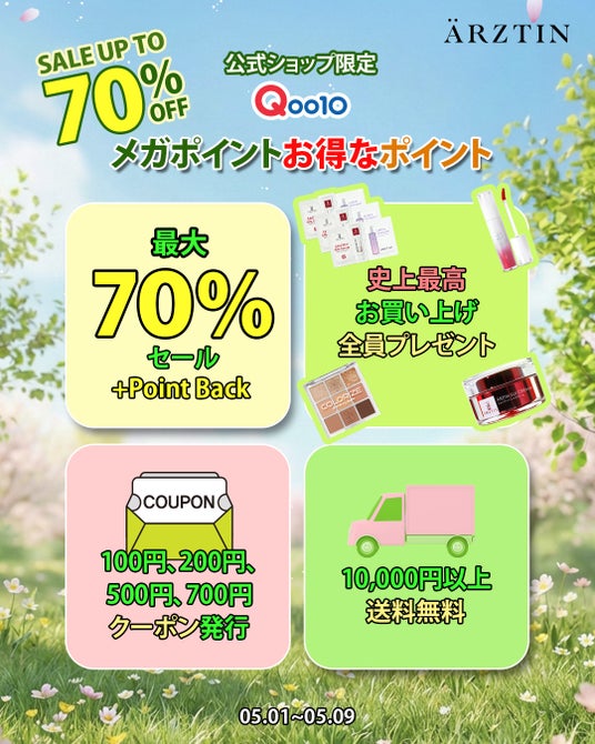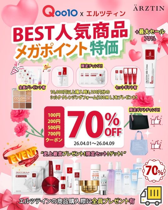 今回のエルツティンQoo10公式ショップのメガポイントでは、最大70%OFFとお買い上げの方全員にはARZTINサンプル3種1個セットを3個(合計9個)をプレゼントとS2NDの「ニュープラネットティント(色はランダム) 1個」1,430円相当 、5,000円以上は「カラーライズスターリーアイズ(色はランダム) 1個」2,970円相当 、10,000円以上は「シルククレンジングフォーム(150ML)3,190円相当1個」をプレゼント。 以前よりお得なクーポンも700円クーポン、500円クーポン、200円クーポン、100円クーポン様々なクーポンを発行して10,000円以上は送料が無料のチャンスがありますのでぜひ、楽しんで下さい。