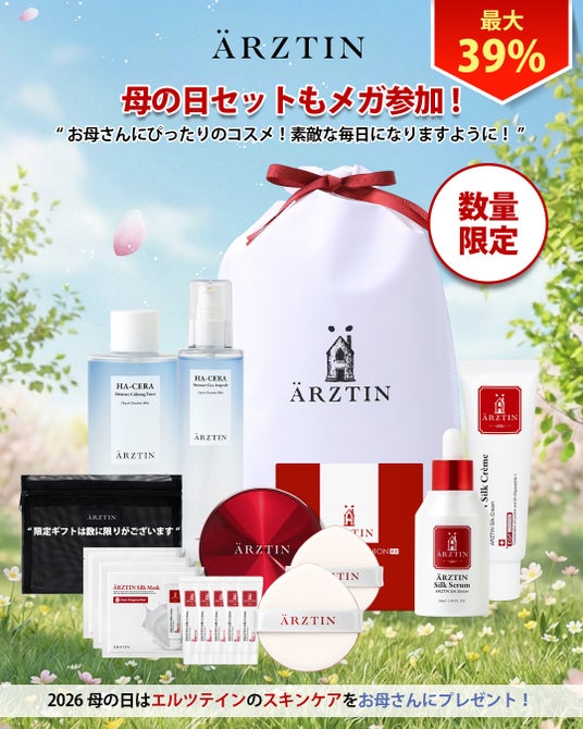 今回メガポイントで注目なセールポイントは!2026の母の日セットにある「シルクセラム(50ML)」最大セール39%でさらにメガポイントイベント割も追加でダブルセール対象。今ご購入するとシルククリーム50Gの現品容量10Gの5個分トマスクシート3枚入りそうおしてポーチももらえるチャンス。シルクセラムは多くのリピーターを抱える大人気商品としてエルツティンブランドの代名詞にもなっているスキンケア商品である。べたつかずシルクのようになめらかなハリ肌を目指す、マイルドなフォーミュラで敏感なお肌にも使える。シルクセラムは弾力効果がありEGFリポソームと3GFコンプレックス配合で早くお肌の弾力を回復させる。17種類の肌アミノ酸と3重発酵エキス30,000ppm配合で 肌に深い保湿を提供し、乾燥を防ぎ、肌をしっとりと保ちますので高保湿光彩効果がある。今回単品のシルクセラム(50ml)にもシルククリーム10g2個とシルクマスクシート2枚のセットで最大セール!最大プレゼント!