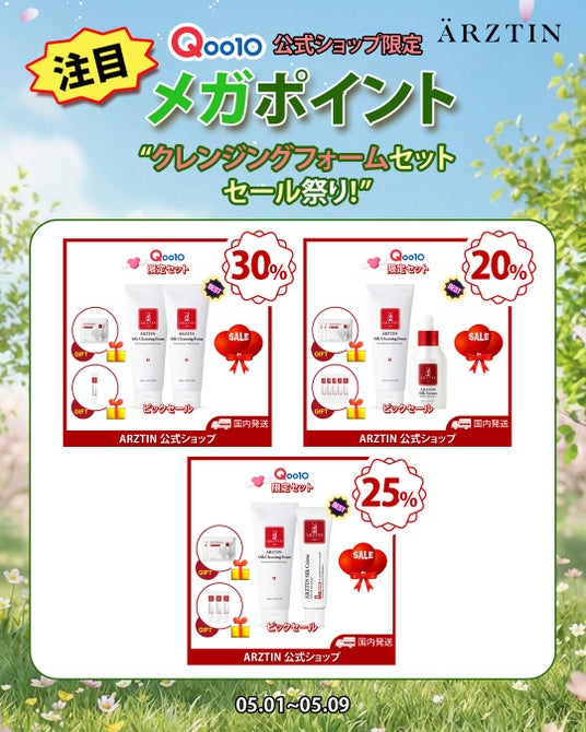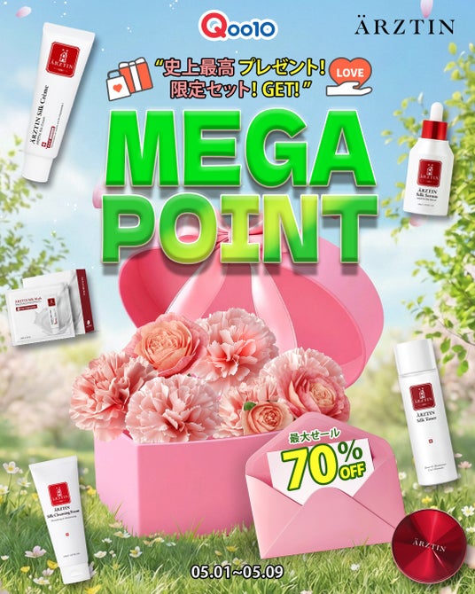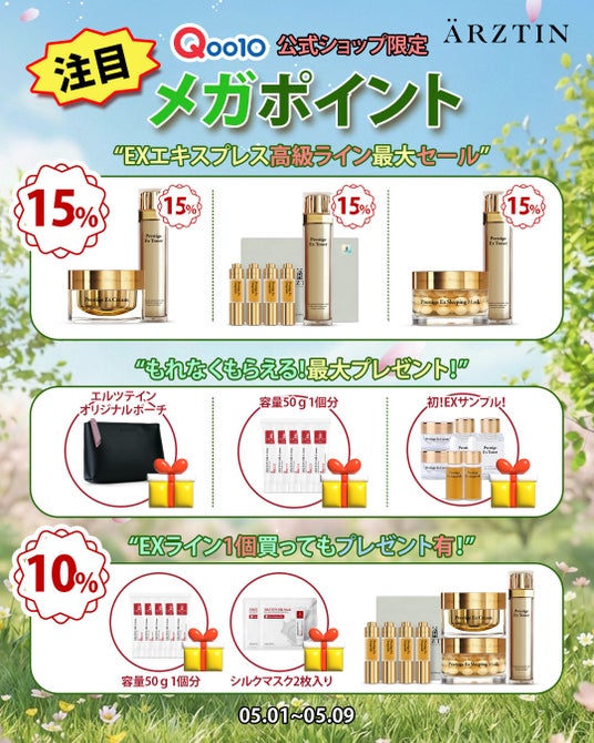今回エルツティンQoo10メガポイントで最大70%セール+メガポを行う。そうして、今までここまでセールしてない商品「シルクセラム(50ML)」が母の日セットでさらにメガポイントセールも含む最大セールのお得なショッピング可能。注目は様々なセット構成が有り、史上最大プレゼントをもらえる!チャンス!全員プレゼントでS2NDニュープラネットティント1個(色ランダム)とエルツテイン人気商品サンプルセットや5,000円以上ご購入の方はS2NDカラーライズスターリーアイズ1個(色ランダム)でさらに10,000円以上にはエルツテインシルククレンジングフォーム(150ML)(定価3,190円税込)をプレゼントもらえるチャンス。そうして、エルツテインの高級ラインプレステージEXラインもメガポイントに初参戦!お得なセットの企画もあり、シルクラインをより安く買える機会もある。特に今回はシルククレンジングフォームとヒアセララインがビックセール中!エルツティンメガポイントを楽しんで下さい。詳細はイメージを参考してください。