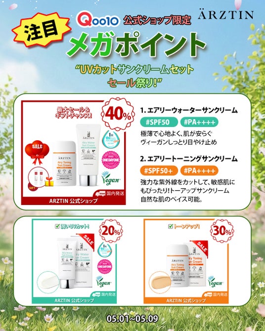 そうして、エルツティンのヴィーガンラインの『エアリーウォーターサンクリーム』20%セール『エアリートーニングサンクリーム』も30%セールでメガポイントに参戦する。2個セット構成は40%セール中でしるくクリーム10g2個付きエルツテインのUVカットはしっとりとしたスキンケアクリームのようなマイルドなつけ心地で優しく使えるUVカットの日やけ止めである。ベビーから大人まで使える優しい日やけ止めで紫外線から肌を守ってマイルドな潤いが肌を保護してくれる。