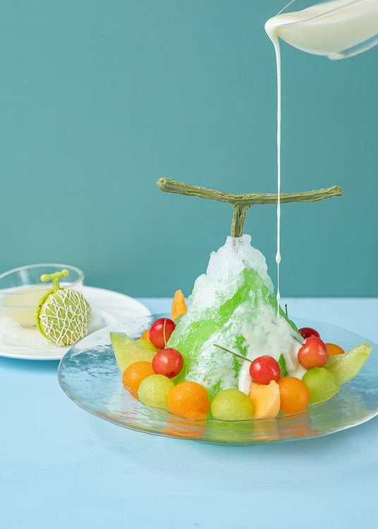 「メロン×さくらんぼ」は、自家製メロンシロップを重ねた純氷に、黄と緑の瑞々しいメロンと上品な味わいのさくらんぼを飾った、涼やかで華やかなこの季節だけの旬の魅力が楽しめる一品です。氷の中には、フレッシュメロンと”パンナコッタ”を忍ばせ、食べ進めるたびにうれしいサプライズ。別添えのメロンフォルムのマカロンと練乳で、味わいの変化もお楽しみいただけます。