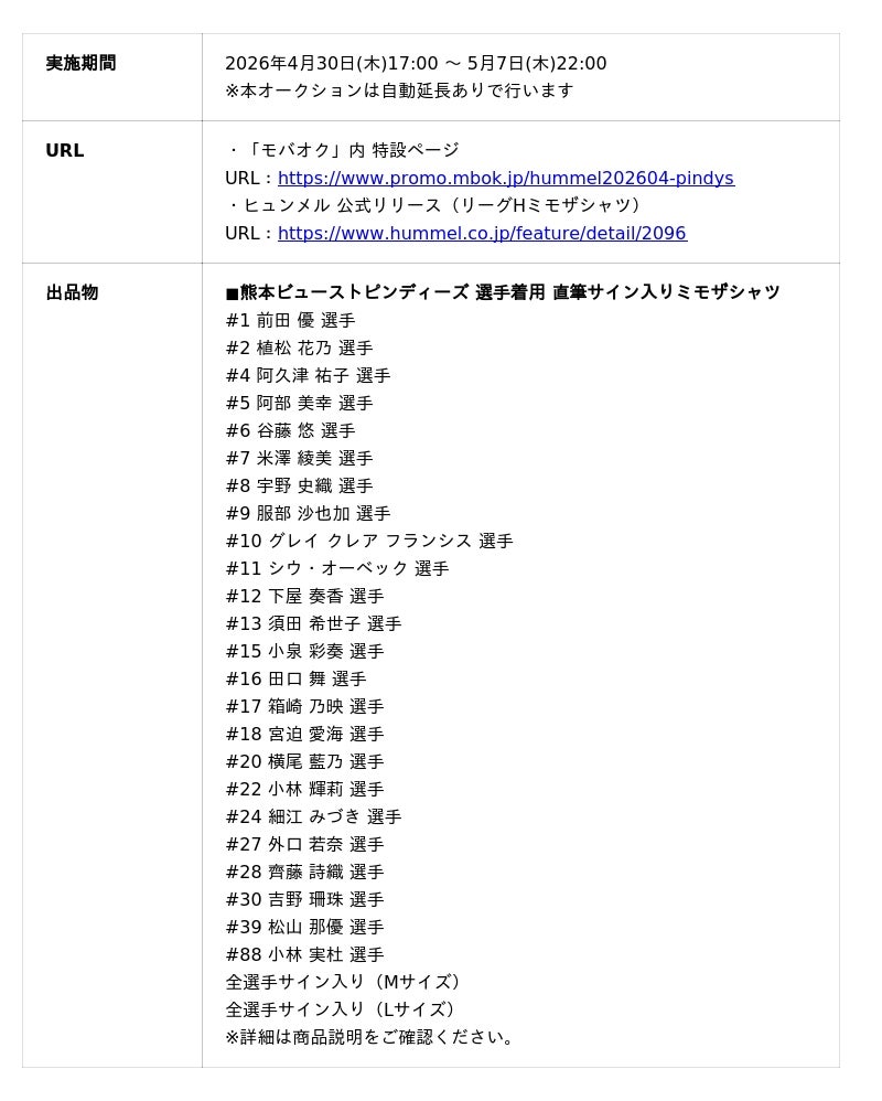 【熊本ビューストピンディーズ×ヒュンメル ミモザシャツ チャリティーオークション 概要】
