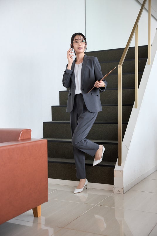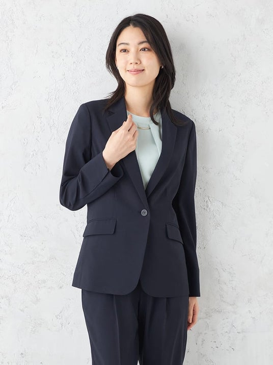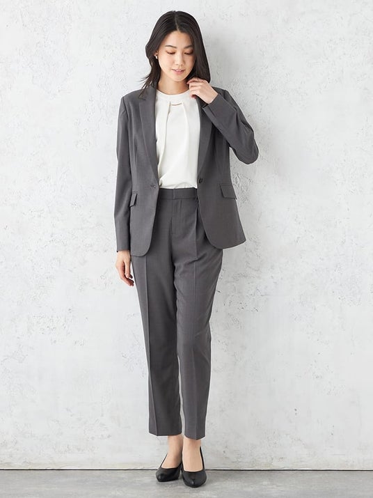 パンツはセンタープレスで脚長効果。ウエスト後ろゴムで長時間の座り仕事や食後もラクが続きます。