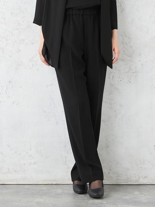 総ゴム仕様のパンツで楽な履き心地を実現しながら、前開きブラウスできちんと見えるパンツスタイル。