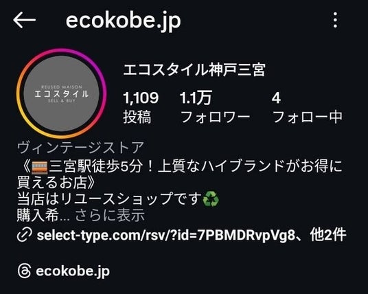 エコスタイル神戸三宮店の公式Instagramアカウントは、ブランド古着の魅力を伝える発信を継続し、フォロワー数が1万人を突破。2026年4月27日時点では約1万1,000人まで伸長しています。