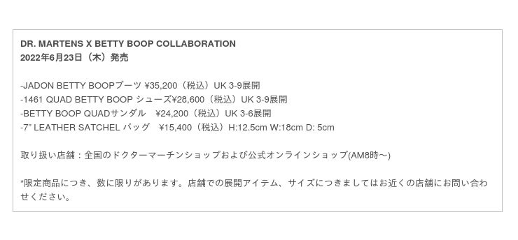 ドクターマーチンとベティ・ブープのコラボレーションコレクションは2022年6月23日(木)より全国のドクターマーチンと公式オンラインショップにて発売開始。