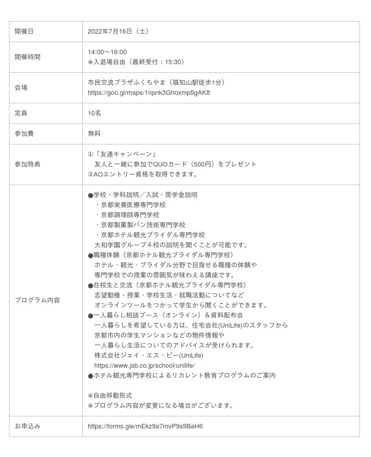 2022年7月16日(土)学校法人大和学園グループは京都府福知山市へ出張し、栄養・医療事務・調理・製菓・製パン・ホテル・旅行・観光・ブライダルに興味のある方を対象としたオープンキャンパスを実施します。世界観光都市「京都」で学ぶ魅力や、ホスピタリティ業界で働く魅力について丁寧に説明します。ホスピタリティ業界に興味がある方はぜひこの機会にご参加下さい。(新型コロナウイルス感染症予防対策として、マスクの着用や検温、アルコール消毒を十分に行い、3密を避けて実施いたします。)