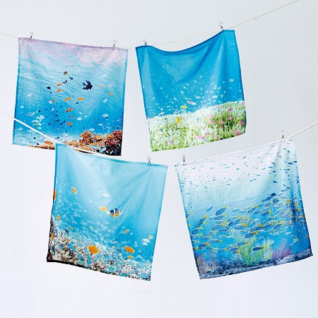 鍵井さんが撮影した色彩あふれる水中写真をプリントした綿100%の大判ダブルガーゼハンカチです。