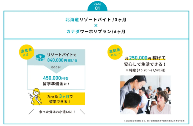 下記プランの一例となります。リゾートバイトの勤務地は温泉地・北海道・沖縄・離島から、ワーホリの勤務地はカナダ・オーストラリアからお選びいただけます。