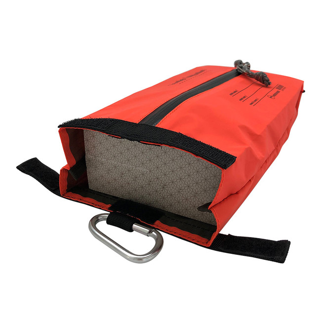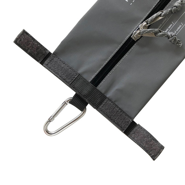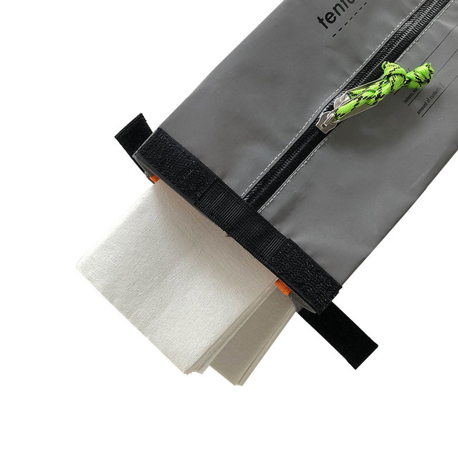 本体上面、ティシューを取り出す部分は止水ファスナー仕様。使用時には開けて、収納時には閉じて汚れを防ぐことができます。また、夜間結露しやすいキャンプ時にも、中のティシューが湿ってしまうのを防ぐ効果があります。(縫製部分は止水処理されていないため、完全な防水仕様ではありません)